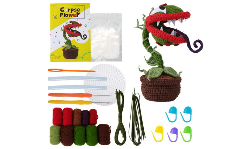 Le jeu de démarrage tout-en-un pour le crochet comprend : manuel, fil de coton, aiguille à coudre à gros yeux, fil de fer vert, crochets, marqueurs de points de tricot, coton de rembourrage, bâtonnets de rembourrage en plastique, joint circulaire et tissu non tissé, le tout commodément rangé dans une pochette de transport.