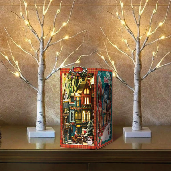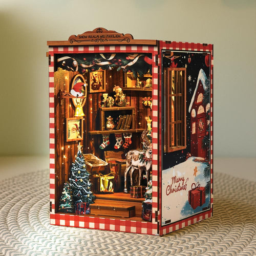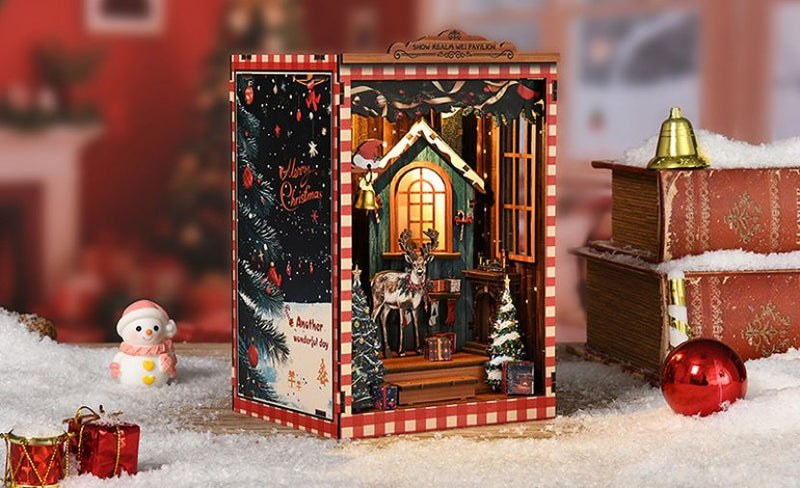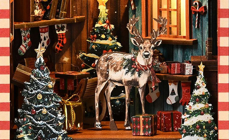 Sapins scintillants, étagères décorées et un renne accueillant transforment ce coin lecture en un véritable univers hivernal. Une douce ambiance de Noël qui illuminera n'importe quelle pièce ou étagère.