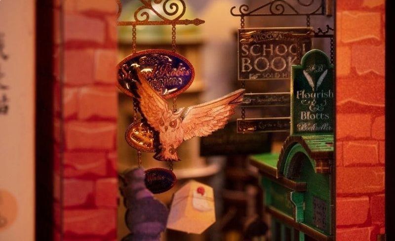 Ce coin lecture est conçu avec des détails parfaits, des enseignes complexes des boutiques à la chouette magique transportant une lettre, donnant vie à la scène.