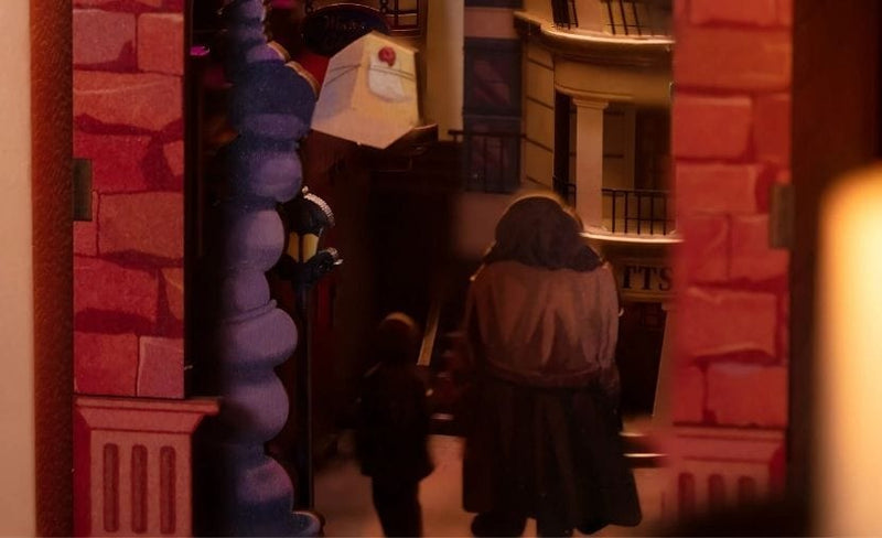 Nichée entre des devantures enchantées, cette miniature capture la magie du monde des sorciers de Harry Potter, des magasins de livres de sorts aux chouettes qui livrent des lettres.