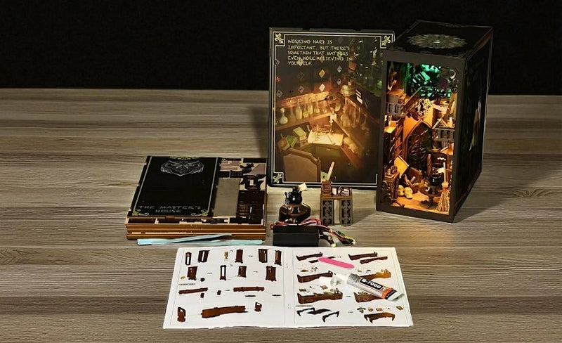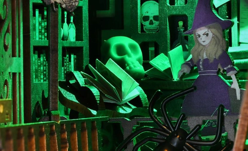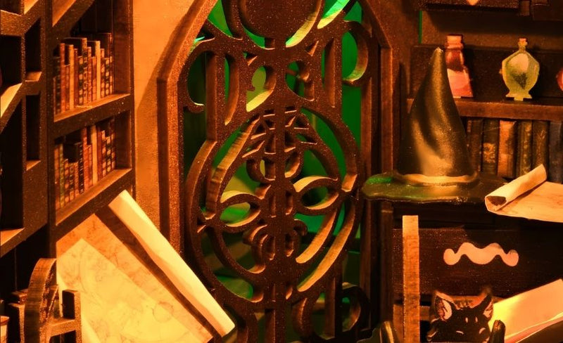 Chaque étagère sculptée, chaque flacon de potion et chaque symbole enchanté est fabriqué à partir de bois découpé avec précision, capturant ainsi l'essence même d'une mystérieuse chambre d'alchimiste.
