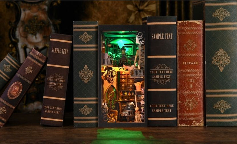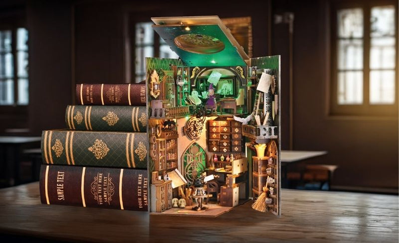 Conçu comme un livre relié, le tout cache en son sein l'univers fantaisiste d'un alchimiste, parfait comme pièce maîtresse magique pour votre étagère ou votre bureau.