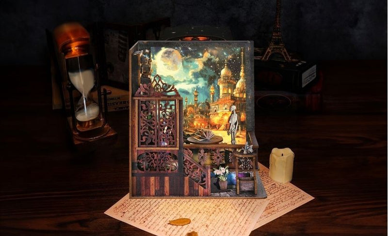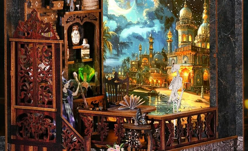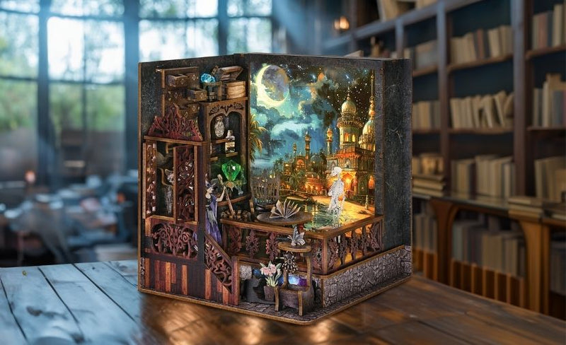 Conçu comme un livre décoratif, L'Exploration magique s'ouvre pour révéler une rue fantaisiste remplie de charme fantastique, parfaite pour être exposée sur une étagère.